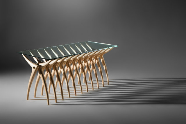 Maple was chosen due to its light delicate properties. Glass was selected for the table top so visual connection with the configuration is maintained from all perspectives.  Individual entities are combined to form one sculptural piece resulting in Ardú.  The overall length can be modified by adding or reducing the amount of legs for each table.