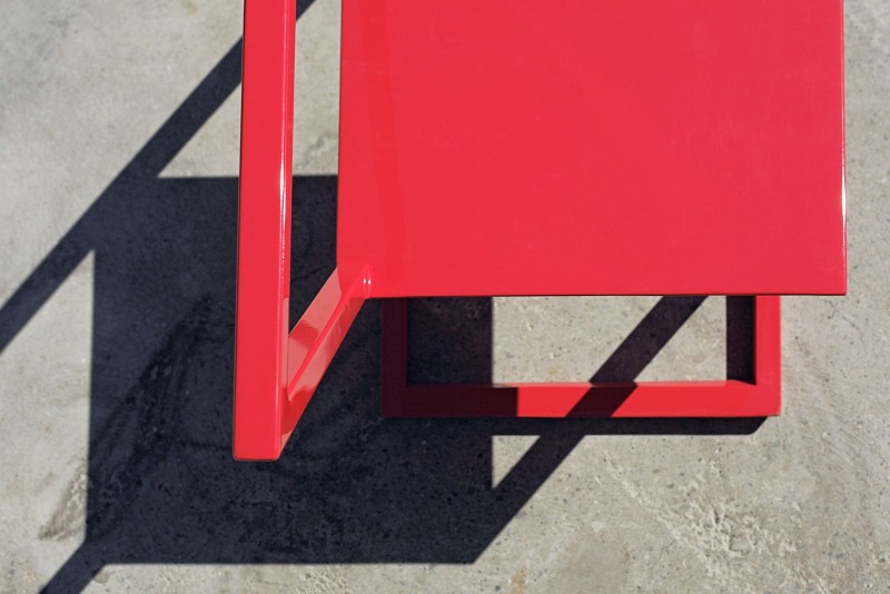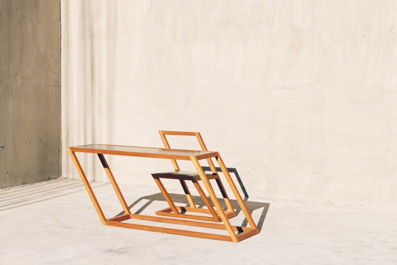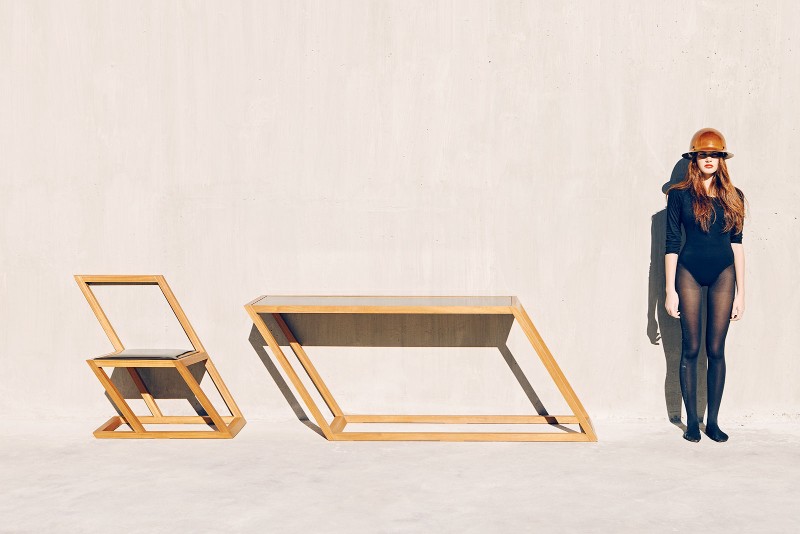 The XYZ interior design studio’s characteristic approach is ever-present in their series of furniture, namely chairs and tables, which have been designed to tilt as if they are collapsing on one side.
